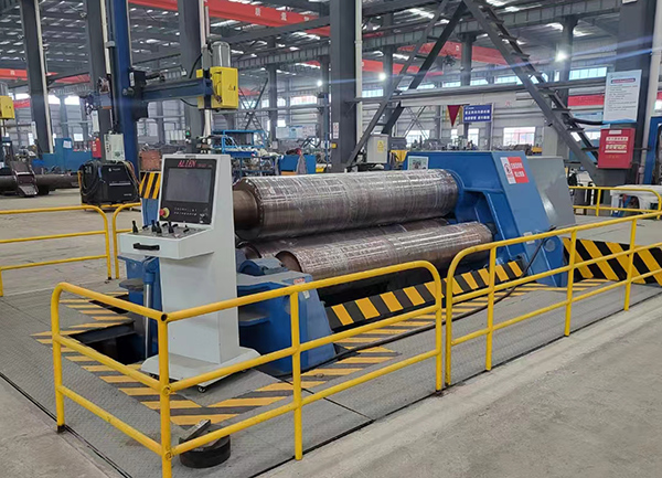 第二步是工作輥?zhàn)鬟M(jìn)給運(yùn)動(dòng),即進(jìn)行三點(diǎn)彎曲,有的卷板機(jī)是上輥?zhàn)鲏合逻M(jìn)給,有的是下輥或側(cè)輥?zhàn)飨蛏系倪M(jìn)給運(yùn)動(dòng),為敘述方便,根據(jù)相對(duì)運(yùn)動(dòng)的原理,將工件和下輥或側(cè)輥看作靜止不動(dòng)的,上輥?zhàn)鲏合逻\(yùn)動(dòng):卷圓筒工件上輥壓下時(shí)與下輥平行,卷錐筒工件上輥壓下時(shí)與下輥傾斜:壓下量越多,工件與上輥接觸的母線及附近曲率越大;第三步是通過(guò)工作輥的回轉(zhuǎn)運(yùn)動(dòng)讓工件回轉(zhuǎn),同時(shí)保證上輥的壓下量不變,使工件的每一個(gè)母線具有相同的曲率或曲率分布,成為圓筒和錐筒。